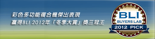 BLI(Buyers Laboratory Inc.)成立於1961年,是美國最具權威的獨立辦公設備評測機構之一。其專業、公正、嚴謹的態度使得BLI成為全球知名的評測權威機構之一;一年二次的”年度大賞”獎,是BLI用來肯定在BLI專業的測試及評價期間內,在硬體及軟體表現上最傑出的商品。這次的「2012年冬季大賞」獎,BLI研究人員制訂了一個相當嚴謹的評價程序,並且包含了大規模列印的耐久性測試。能夠獲頒年度大賞的機種都是因為在各個方面有著優於其他競爭機種的傑出表現,這些方面包含:穩定性、生產力、影像品質、功能性、使用及管理便利性及商品價值等,因此,能夠獲得BLI的獎項或推薦是相當不容易的,所以BLI獎項也為成全球各地消費者或IT主管在進行設備採購決策時值得信賴的依據,關於BLI的更多詳細資訊,請瀏覽www.buyerslab.com。